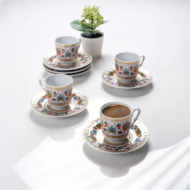 Güral Porselen’in Sedef serisinin 4543 kodlu bu zarif kahve fincan takımı; geleneksel motifleri, altın yaldız detayları ve çok renkli desenleriyle göz alıcı bir sunum sunuyor. 6 kişilik bu 12 parçalık set, hem günlük kullanım hem de özel sunumlar için sofistike bir tercih.